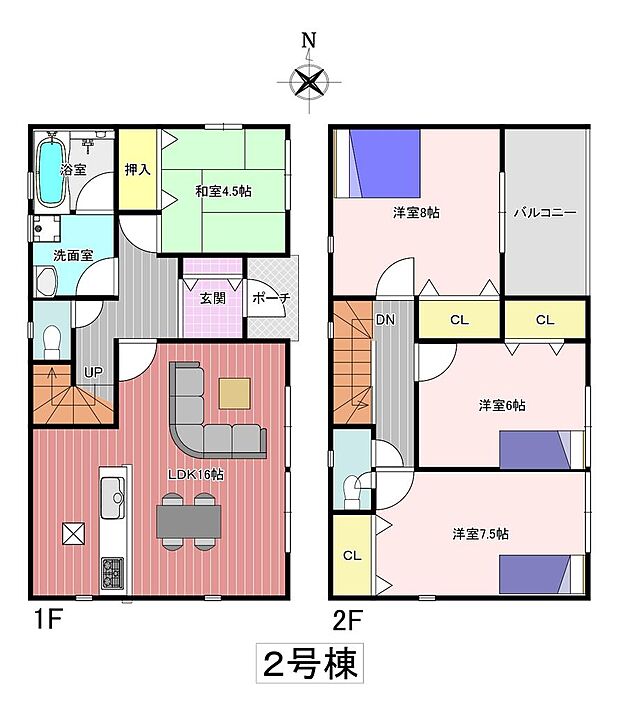| 間取り | 4LDK 間取り内訳:リビングダイニングキッチン 16帖(1階)・和室 4.5畳(1階)・洋室 6帖(2階)・洋室 7.5帖(2階)・洋室 8帖(2階) |