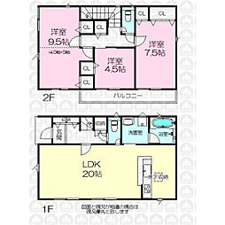 | 間取り | 3LDK 間取り内訳:リビングダイニングキッチン 20帖(1階)・洋室 9.5帖(2階)・洋室 7.5帖(2階)・洋室 4.5帖(2階) |