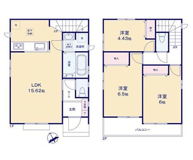 間取り内訳:リビングダイニングキッチン 15.6帖(1階)・洋室 4.4帖(2階)・洋室 6.5帖(2階)・洋室 6帖(2階)