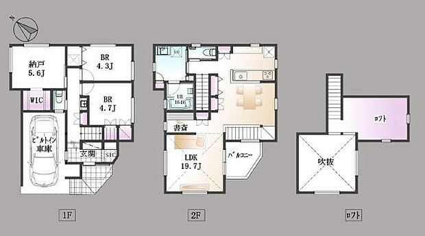 | 間取り | 2SLDK 間取り内訳:洋室 4.7帖(1階)・洋室 4.3帖(1階)・収納 5.6帖(1階)・リビングダイニングキッチン 19.7帖(2階) |