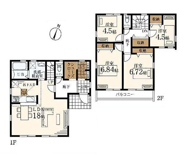 | 間取り | 4LDK 間取り内訳:リビングダイニングキッチン 18帖(1階)・洋室 4.5帖(2階)・洋室 6.8帖(2階)・洋室 6.7帖(2階)・洋室 4.5帖(2階) |