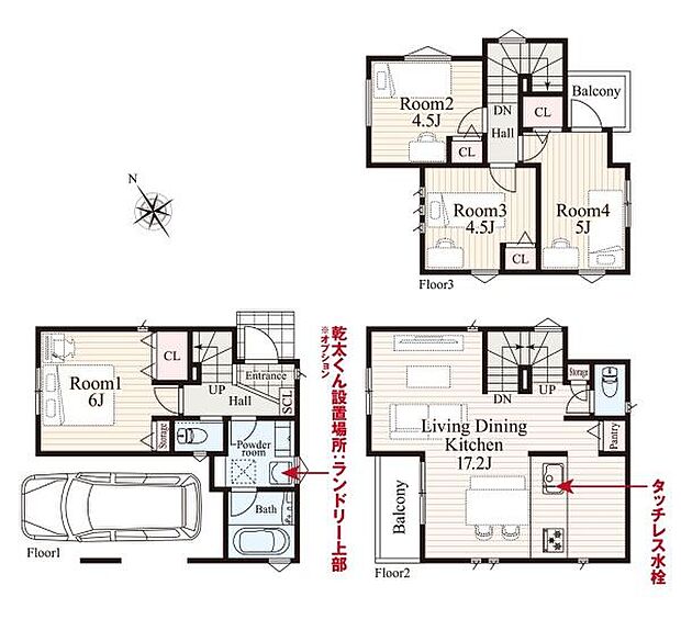 | 間取り | 4LDK 間取り内訳:洋室 6帖(1階)・リビングダイニングキッチン 17.2帖(2階)・洋室 4.5帖(3階)・洋室 4.5帖(3階)・洋室 5帖(3階) |