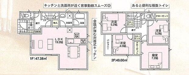 | 間取り | 4LDK 間取り内訳:リビングダイニングキッチン 19帖(1階)・洋室 5.2帖(2階)・洋室 4.5帖(2階)・洋室 5.2帖(2階)・洋室 7.2帖(2階) |