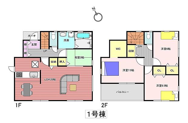 間取り内訳:リビングダイニングキッチン 20帖(1階)・和室 3畳(1階)・洋室 6帖(2階)・洋室 6.5帖(2階)・洋室 7.5帖(2階)