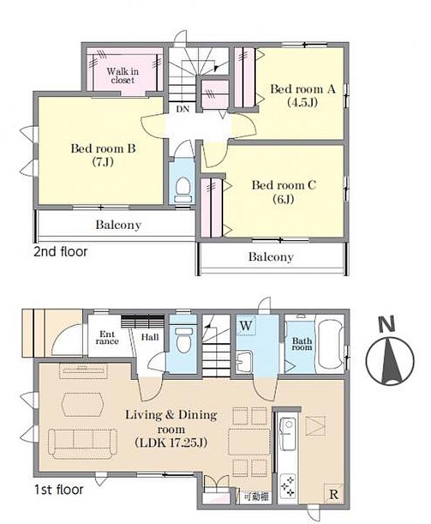 | 間取り | 3LDK 間取り内訳:リビングダイニングキッチン 17.2帖(1階)・洋室 7帖(2階)・洋室 6帖(2階)・洋室 4.5帖(2階) |
