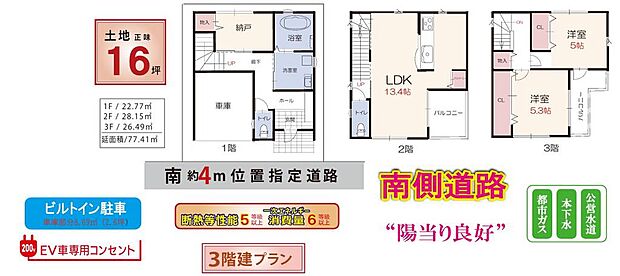 間取り内訳:収納(1階)・リビングダイニングキッチン 13.4帖(2階)・洋室 5帖(2階)・洋室 5.3帖(2階)