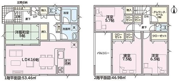 | 間取り | 4SLDK 間取り内訳:リビングダイニングキッチン 16帖(1階)・和室 5畳(1階)・洋室 7.5帖(2階)・洋室 6.5帖(2階)・洋室 5.7帖(2階)・収納 2帖(2階) |