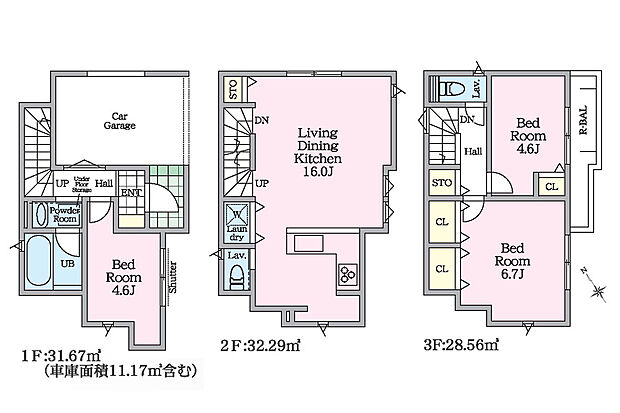 | 間取り | 3LDK 間取り内訳:洋室 4.6帖(1階)・リビングダイニングキッチン 16帖(2階)・洋室 6.7帖(3階)・洋室 4.6帖(3階) |
