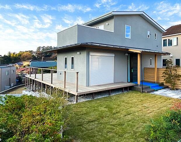 子育てグリーン住宅。99坪の広い敷地、大きなウッドデッキのある南向きの庭。四季折々の鎌倉の緑と青い空