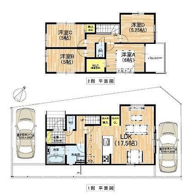 | 間取り | 4LDK 間取り内訳:リビングダイニングキッチン 17.5帖(1階)・洋室 6帖(2階)・洋室 5.2帖(2階)・洋室 5帖(2階)・洋室 5帖(2階) |