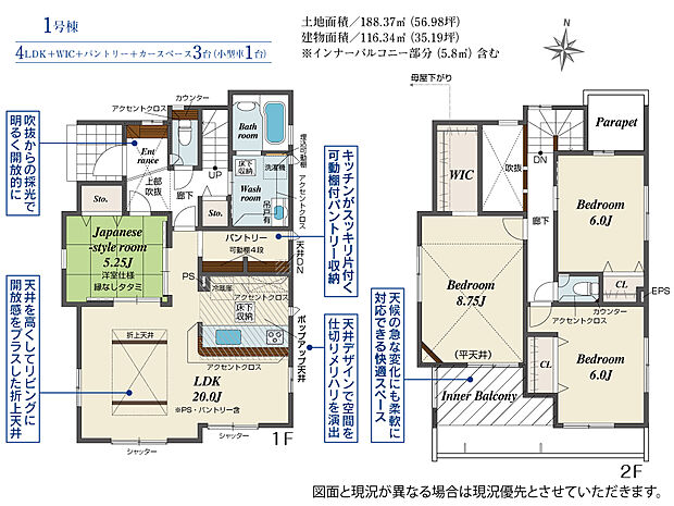 | 建物面積 | 116.34m2(約35.19坪)~119.29m2(約36.08坪) | ||