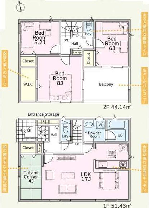| 間取り | 3LDK 間取り内訳:リビングダイニングキッチン 17帖(1階)・洋室 8帖(2階)・洋室 6帖(2階)・洋室 5.2帖(2階) |