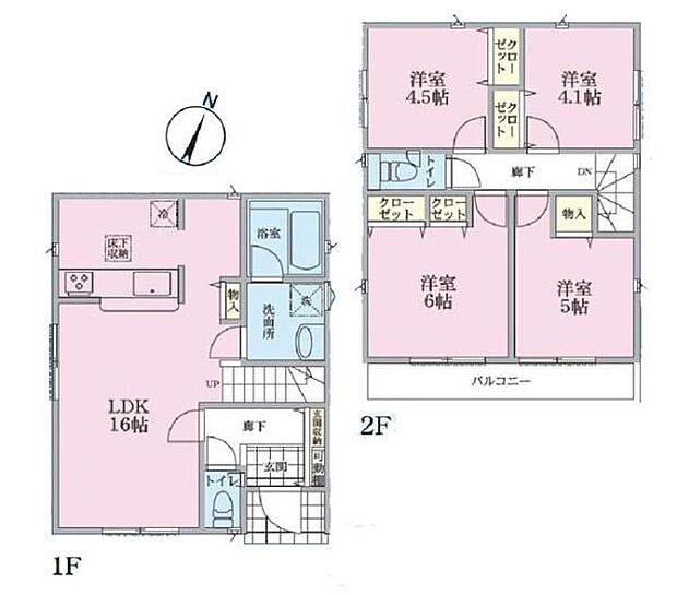 | 間取り | 4LDK 間取り内訳:リビングダイニングキッチン 16帖(1階)・洋室 4.1帖(2階)・洋室 4.5帖(2階)・洋室 5帖(2階)・洋室 6帖(2階) |
