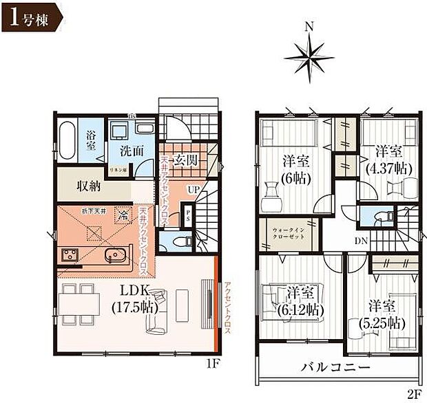| 間取り | 4LDK 間取り内訳:リビングダイニングキッチン 17.5帖(1階)・洋室 6.1帖(2階)・洋室 6帖(2階)・洋室 5.2帖(2階)・洋室 4.3帖(2階) |