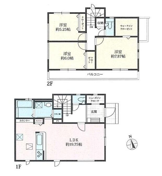 間取り内訳:リビングダイニングキッチン 19.7帖(1階)・洋室 5.2帖(2階)・洋室 6帖(2階)・洋室 7.8帖(2階)