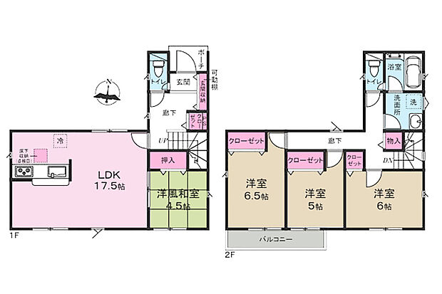間取り内訳:リビングダイニングキッチン 17.5帖(1階)・和室 4.5畳(1階)・洋室 6.5帖(2階)・洋室 6帖(2階)・洋室 5帖(2階)