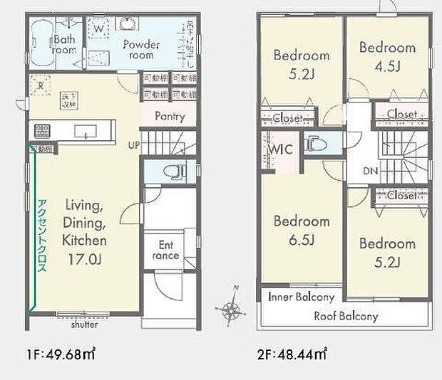| 間取り | 4LDK 間取り内訳:リビングダイニングキッチン 17帖(1階)・洋室 6.5帖(2階)・洋室 5.2帖(2階)・洋室 5.2帖(2階)・洋室 4.5帖(2階) |