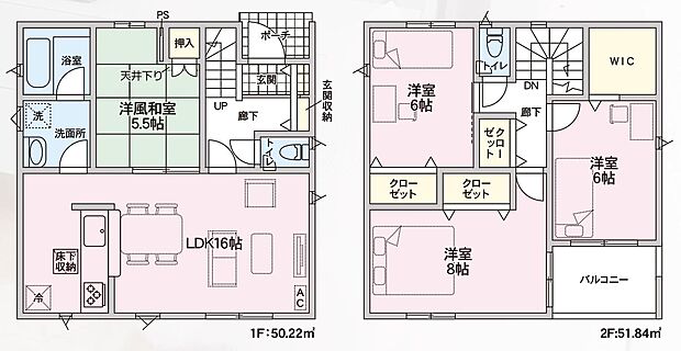 | 間取り | 4LDK 間取り内訳:リビングダイニングキッチン 16帖(1階)・和室 5.5畳(1階)・洋室 6帖(2階)・洋室 6帖(2階)・洋室 8帖(2階) |
