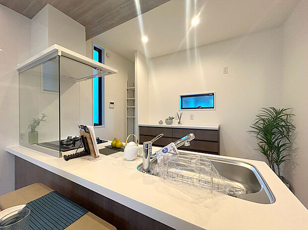 • 【モデルハウス】キッチンガラスパネル仕様♪作業中でも全体を見渡せる設計♪お子様の様子を見ながら料理することが出来ます!