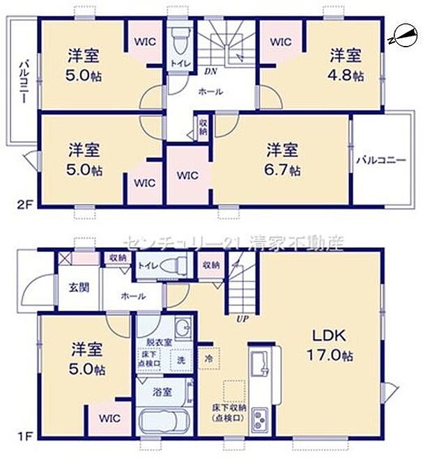 | 間取り | 5LDK 間取り内訳:リビングダイニングキッチン 17帖(1階)・洋室 5帖(1階)・洋室 6.7帖(2階)・洋室 5帖(2階)・洋室 5帖(2階)・洋室 4.8帖(2階) |