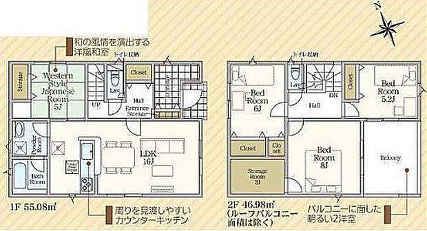 | 間取り | 4LDK 間取り内訳:リビングダイニングキッチン 16帖(1階)・和室 5畳(1階)・洋室 8帖(2階)・洋室 6帖(2階)・洋室 5.2帖(2階) |