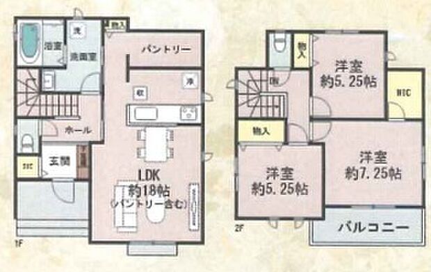 間取り内訳:リビングダイニングキッチン 18帖(1階)・洋室 5.2帖(2階)x2・洋室 7.2帖(2階)