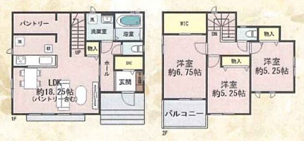 間取り内訳:リビングダイニングキッチン 18帖(1階)・洋室 5.2帖(2階)x2・洋室 6.7帖(2階)