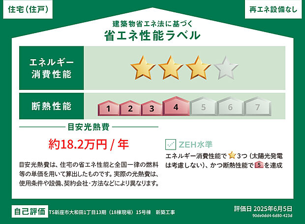- 星マークの数が多いほどエネルギー消費性能が高いことを示しています。再エネ設備のない住宅は★0~★4の5段階評価、再エネ設備がある住宅は★0~★6の7段階評価となります。