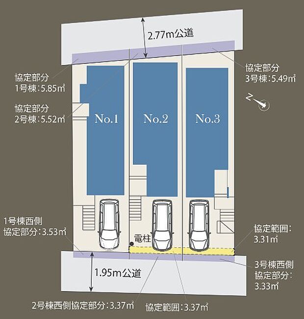 1号棟:北東2.7m 南西1.9m /3号棟:北東2.7m 南西1.9m /2号棟:北東2.7m 南西1.9m