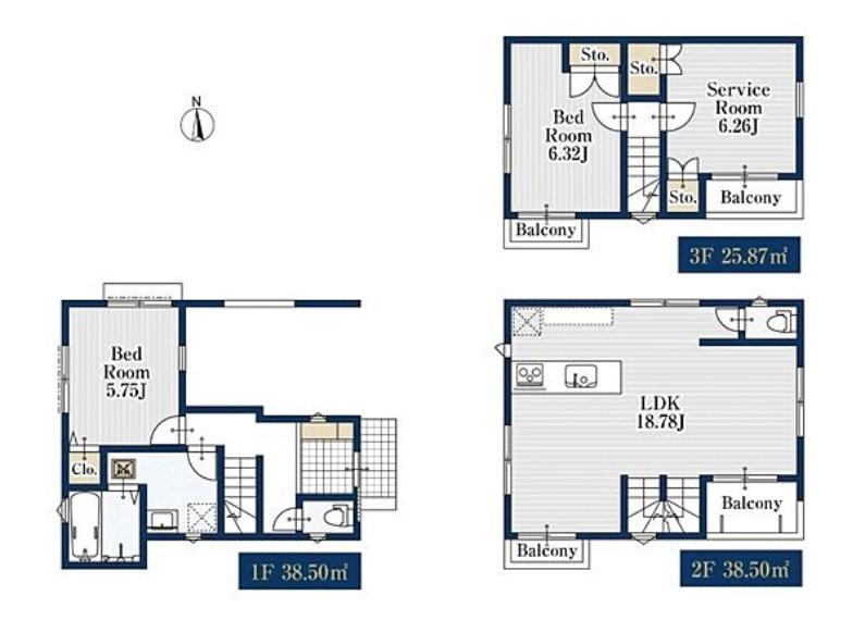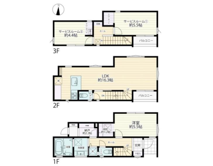 建物は木造3階建、1LDK+2サービスルーム+WICの機能的な間取り。