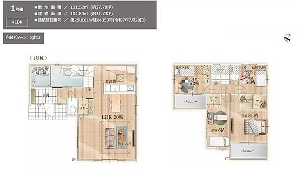 間取り内訳:リビングダイニングキッチン 20帖(1階)・洋室 5.6帖(2階)・洋室 8.6帖(2階)・洋室 6帖(2階)・洋室 5.2帖(2階)