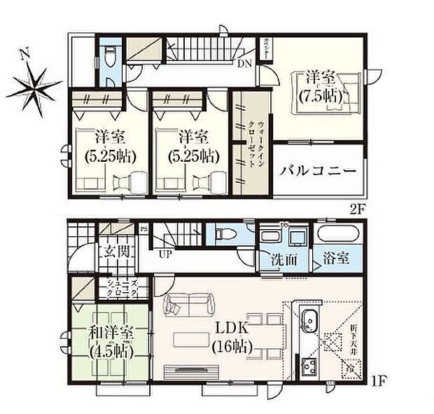 | 間取り | 4LDK 間取り内訳:洋室 7.5帖(2階)・洋室 5.2帖(2階)・洋室 5.2帖(2階)・和室 4.5畳(1階)・リビングダイニングキッチン 16帖(1階) |