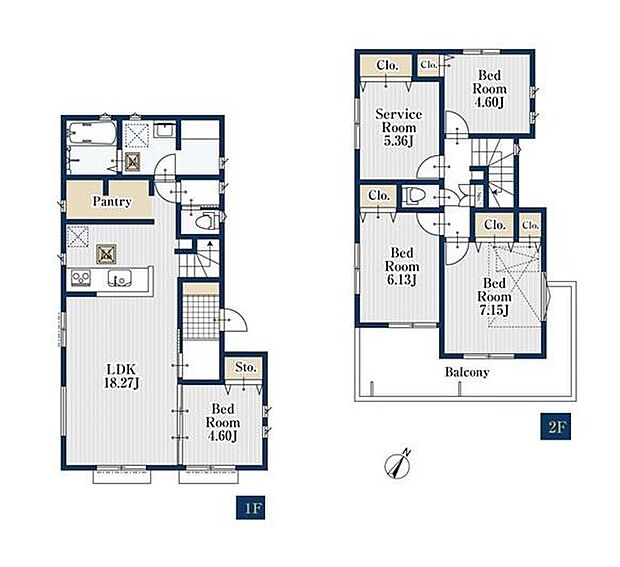 | 間取り | 4SLDK 間取り内訳:リビングダイニングキッチン 18.2帖(1階)・洋室 4.6帖(1階)・洋室 4.6帖(2階)・収納 5.3帖(2階)・洋室 6.1帖(2階)・洋室 7.1帖(2階) |