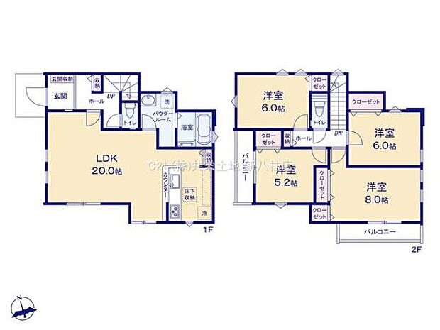 | 間取り | 4LDK 間取り内訳:リビングダイニングキッチン 20帖(1階)・洋室 5.2帖(2階)・洋室 6帖(2階)・洋室 6帖(2階)・洋室 8帖(2階) |