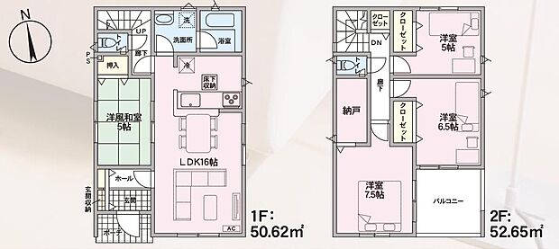 間取り内訳:リビングダイニングキッチン 16帖(1階)・和室 5畳(1階)・洋室 5帖(2階)・洋室 6.5帖(2階)・洋室 7.5帖(2階)・収納 1.5帖(2階)