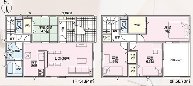 | 間取り | 4LDK 間取り内訳:リビングダイニングキッチン 16帖(1階)・和室 4.5畳(1階)・洋室 6帖(2階)・洋室 6.5帖(2階)・洋室 8帖(2階) |