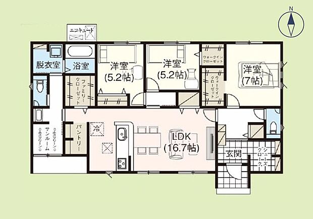 | 間取り | 3LDK 間取り内訳:リビングダイニングキッチン 16.7帖(1階)・洋室 5.2帖(1階)・洋室 5.2帖(1階)・洋室 7帖(1階) |
