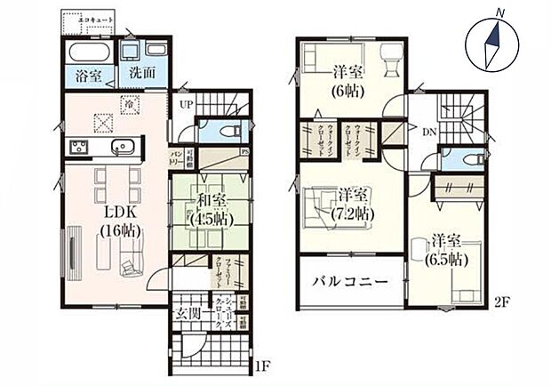 間取り内訳:リビングダイニングキッチン 16帖(1階)・和室 4.5畳(1階)・洋室 6帖(2階)・洋室 6.5帖(2階)・洋室 7.2帖(2階)