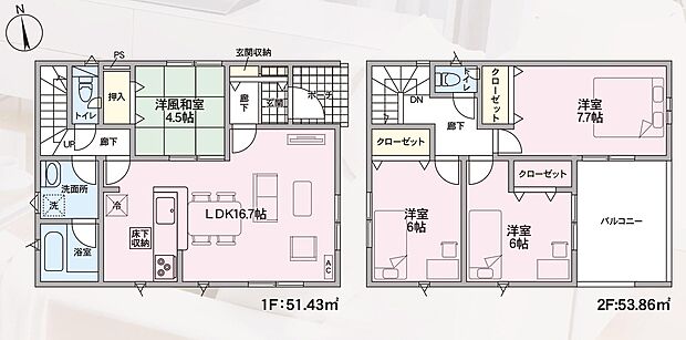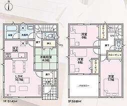 | 間取り | 4LDK 間取り内訳:リビングダイニングキッチン 16.7帖(1階)・和室 4.5畳(1階)・洋室 6帖(2階)・洋室 6帖(2階)・洋室 7.7帖(2階) |