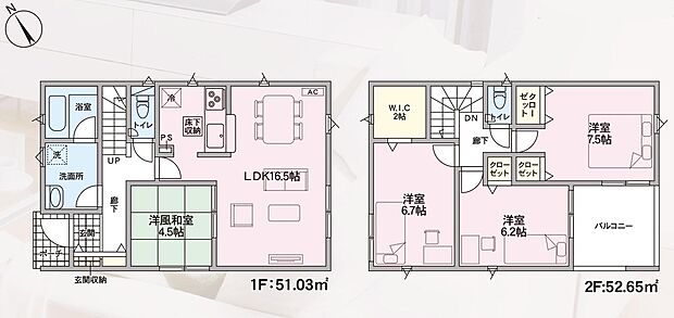 | 間取り | 4LDK 間取り内訳:リビングダイニングキッチン 16.5帖(1階)・和室 4.5畳(1階)・洋室 6.2帖(2階)・洋室 6.7帖(2階)・洋室 7.5帖(2階) |