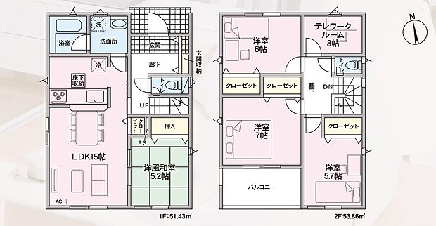 間取り内訳:リビングダイニングキッチン 15帖(1階)・和室 5.2畳(1階)・洋室 5.7帖(2階)・洋室 6帖(2階)・洋室 7帖(2階)・収納 3帖(2階)