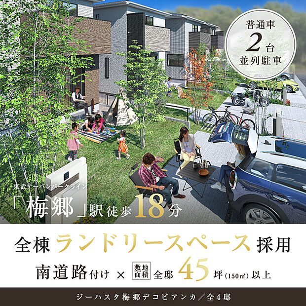 《ポジション》 ■東武アーバンパークライン「梅郷」駅徒歩18分 ■「流山おおたかの森」駅まで電車で11分 ■野田市立みずき小学校徒歩9分 《建物》 ■全邸敷地面積45坪(150m2)以上 ■全邸南道路付け×普通車2台並列駐車 ■ゆとりあるランドリースペースのある暮らし ■2030年レベルのZEH水準を備えた住まい提案 【近隣モデルハウス公開中】 日程:12/27(土).28(日).1/4(日).10(土).11(日).12(月祝) 時間:(1)10:30~(2)13:30~(3)15:30~