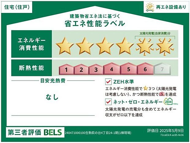 - 星マークの数が多いほどエネルギー消費性能が高いことを示しています。再エネ設備のない住宅は★0~★4の5段階評価、再エネ設備がある住宅は★0~★6の7段階評価となります。