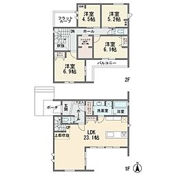 | 間取り | 4SLDK 間取り内訳:リビングダイニングキッチン 23.1帖(1階)・洋室 4.5帖(2階)・洋室 5.2帖(2階)・洋室 6.1帖(2階)・洋室 6.9帖(2階)・収納 3帖(2階) |