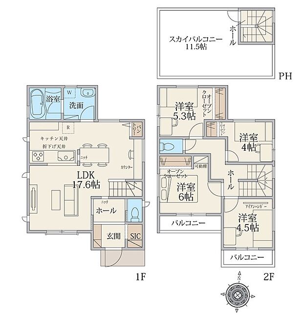 天空の家・広々とした11.5帖のスカイバルコニー付きの新築戸建。17帖超のリビングは家族の団欒やお子様のリビング学習にぴったり! 1階に水廻りがまとまり、家事導線もよく家事もはかどりますね。収納充実!無駄なスペースもなく家具の配置がしやすいですね! 上質な住空間を演出する天空の家で新生活を送りませんか。内装は装飾を抑えた現代的かつ、シンプルな雰囲気の室内です。京成線「海神」駅 徒歩8分の好立地。ご家族の通勤・通学にも大変便利です。