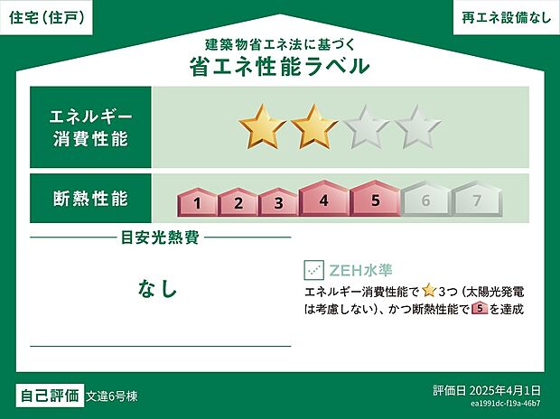 星マークの数が多いほどエネルギー消費性能が高いことを示しています。再エネ設備のない住宅は★0~★4の5段階評価、再エネ設備がある住宅は★0~★6の7段階評価となります。