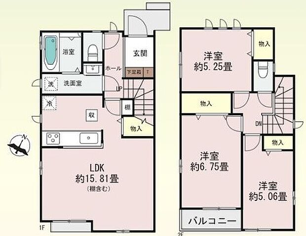 | 間取り | 3LDK 間取り内訳:リビングダイニングキッチン 15.8帖(1階)・洋室 5.2帖(2階)・洋室 5帖(2階)・洋室 6.7帖(2階) |