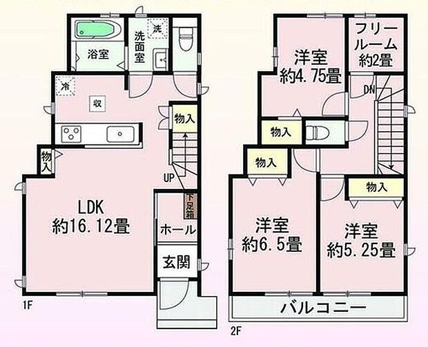 | 間取り | 3SLDK 間取り内訳:リビングダイニングキッチン 16.1帖(1階)・洋室 4.5帖(2階)・洋室 4.7帖(2階)・洋室 6.5帖(2階) |