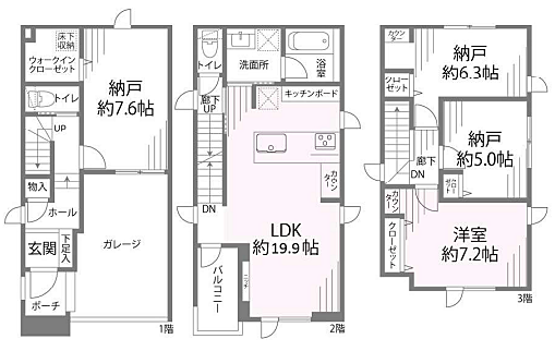 | 間取り | 3SLDK 間取り内訳:洋室 7.6帖(1階)・リビングダイニングキッチン 19.9帖(2階)・洋室 5帖(3階)・洋室 6.3帖(3階)・洋室 7.2帖(3階) |