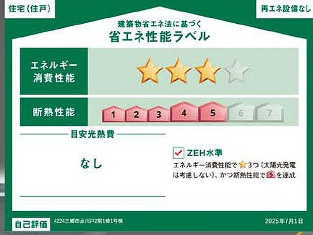 星マークの数が多いほどエネルギー消費性能が高いことを示しています。再エネ設備のない住宅は★0~★4の5段階評価、再エネ設備がある住宅は★0~★6の7段階評価となります。